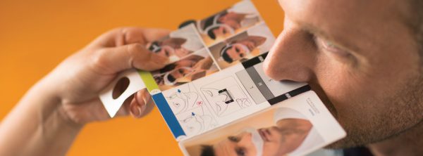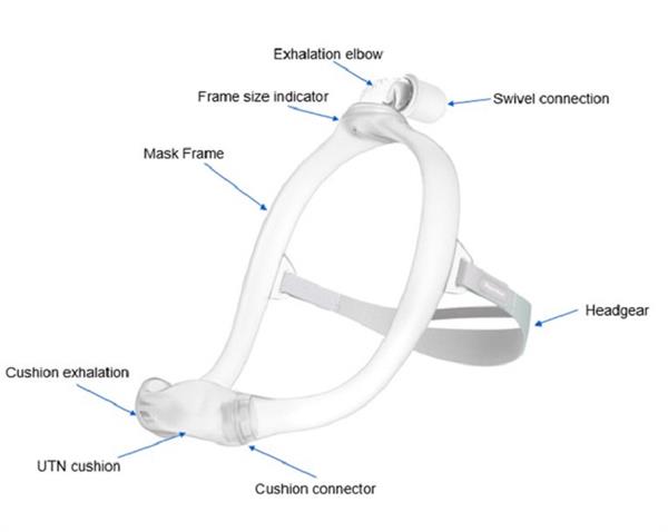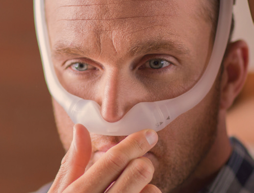 The DreamWear cushion rests under the nose and provides airflow to both nostrils. The cushion does not cover the nose, helping alleviate sores and irritation on the bridge of the nose.
